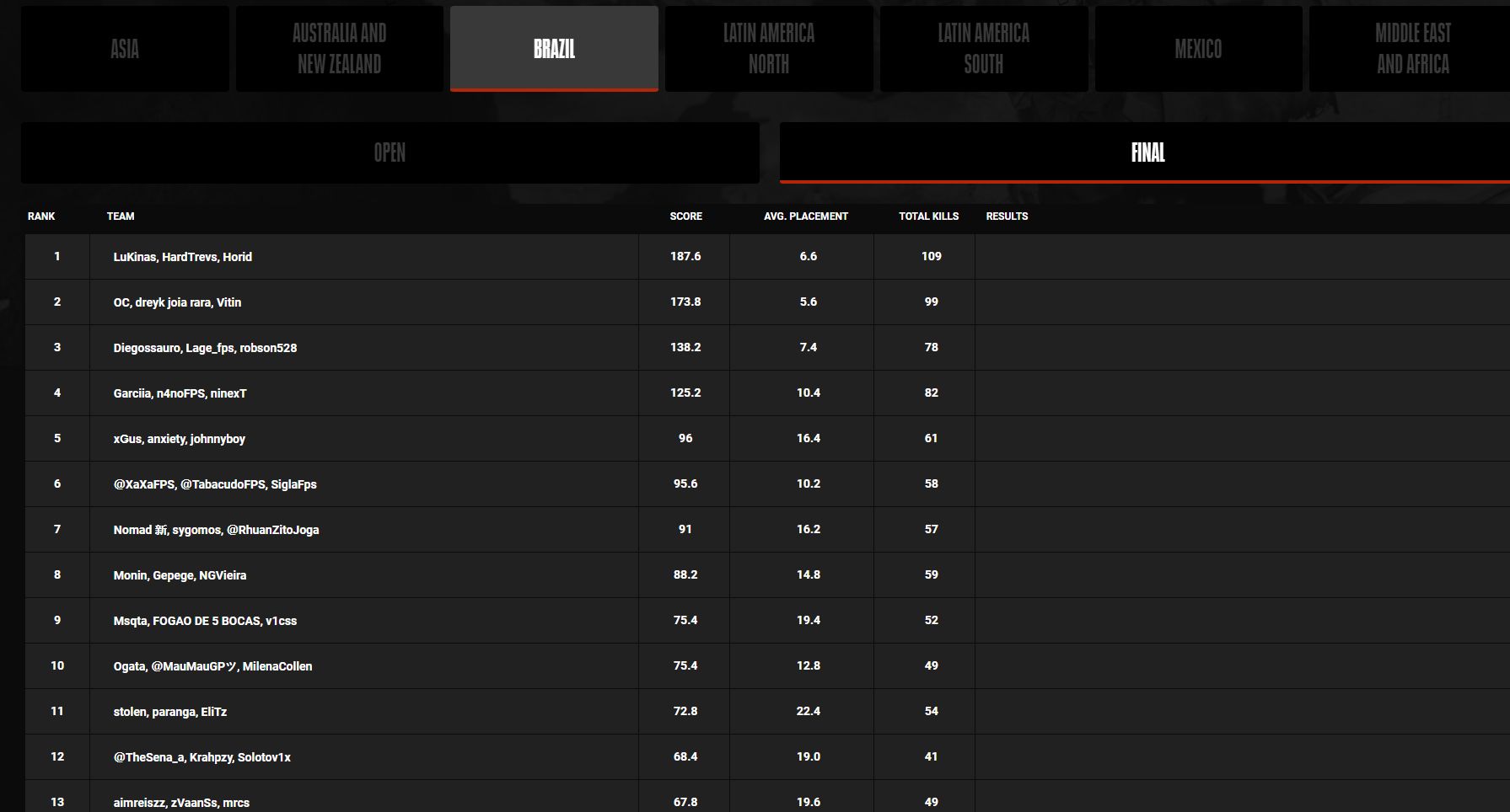 No ultimo dia 16/07/2023, nossa equipe jogou a final reginal, contra 45 equipes classificadas. Conquistando uma otima posicao e se tornando a 7° Melhor equipe Brasileira em Call Of Duty Warzone. Verifique a tabela de classificação a seguir